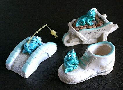 Manorware are small ornaments made for tourist shops and usually have the name of a place or resort on the side, consequently there are quite a few of them. Here are my first three: One fishing off the side of a bridge, one lazing on a wheel barrow and the third sitting on a shoe. I have no idea where they were made but the whole range is now becoming collectible, even having a manorware collectors club.