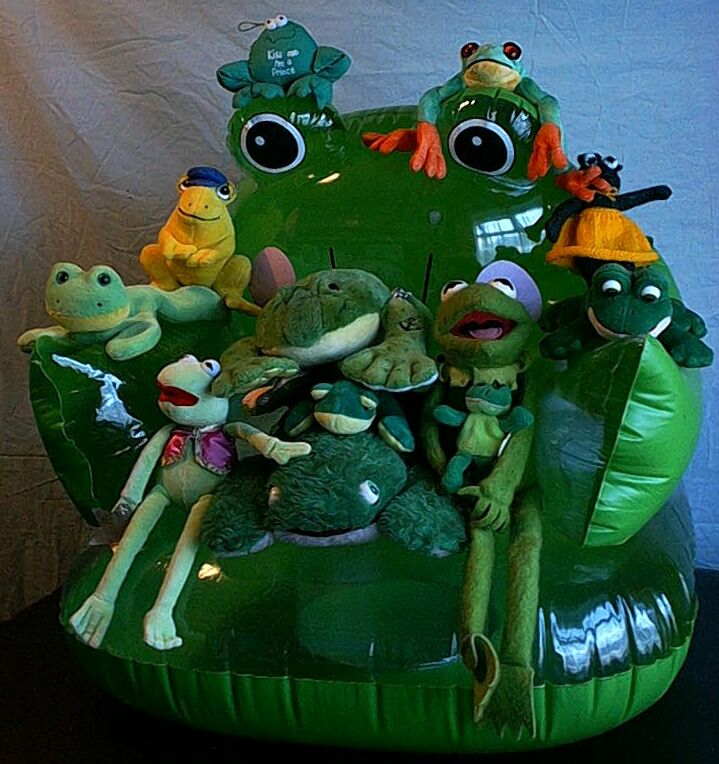 Here are my soft frogs. Amongst them is my only croaking frog and the large Kermit and flat frog that I have had for about 25 years. Some are "bean-filled" and others stuffed, one is a keyring and one a baby play frog who's feet make different noises when squashed.